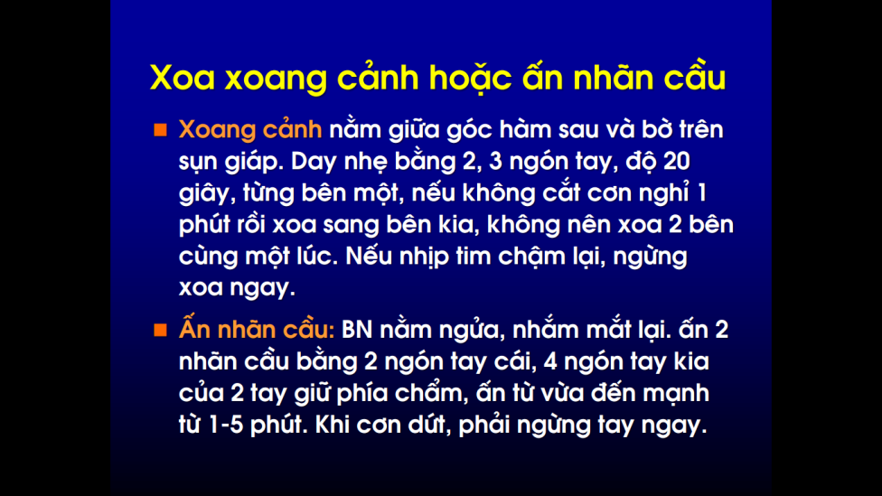 • Cắt cơn cấp: Dùng mặt dẹt của 5 đầu ngón tay mình đập mạnh mấy cái lên x.ức & vùng tim BN à rồi ép tim