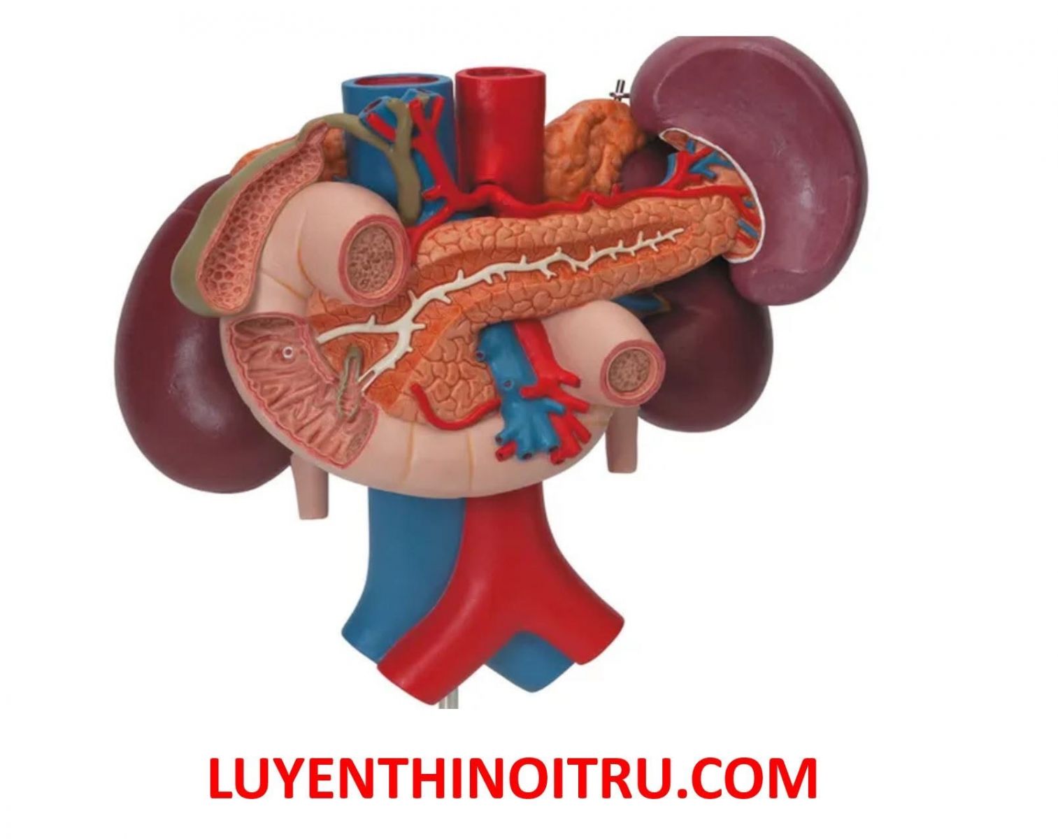 ◦ Mặt sau của đầu tụy liên quan với tĩnh mạch chủ dưới và phần tận cùng của các tĩnh mạch thận. Mỏm móc nằm trước động mạch chủ.