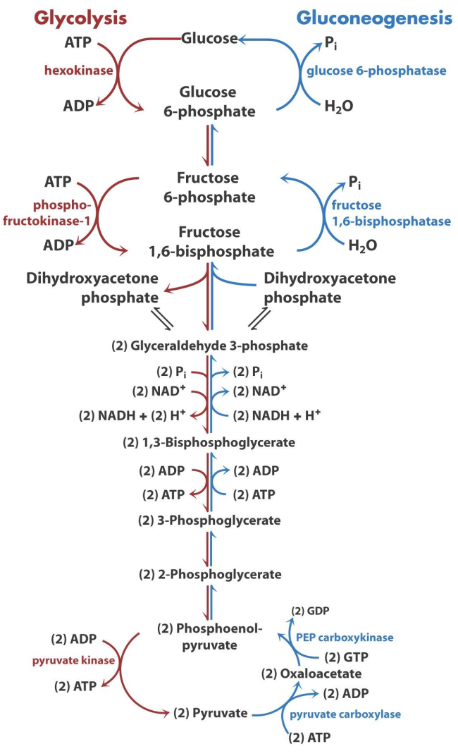 + Tân tạo đường: được điều hòa ở pyruvat carboxylase (acetyl-CoA hoạt hóa) và fructose1,6-diphosphatase (F2,6 diphosphat và AMP ức chế)
