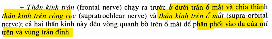 - Nhánh trán thần kinh mắt chứa các sợi cảm giác từ da trán và mí trên