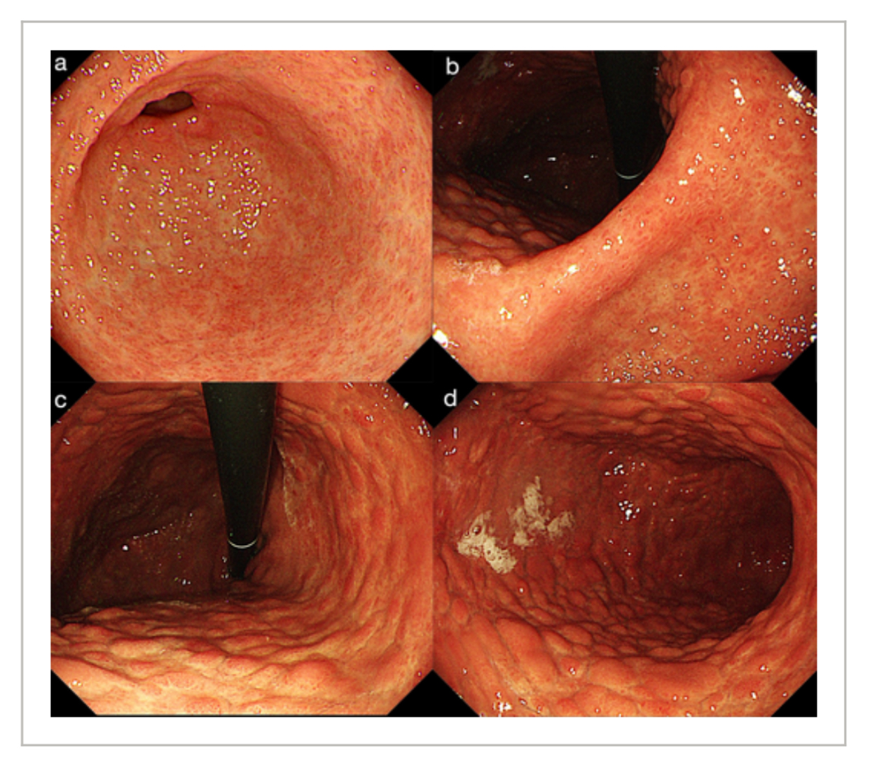 Nội soi tiêu hóa trên cho thấy những thay đổi dạng nốt lan tỏa ở niêm mạc thân vị dưới ánh sáng trắng, đặc trưng bởi các nốt được bao quanh bởi những vùng lõm giống teo niêm mạc, kèm theo niêm mạc hang vị hơi thô ráp (Hình 1).